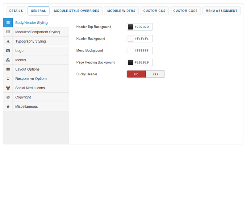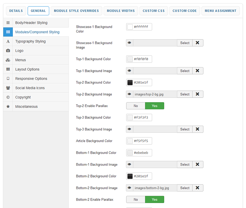 Module Style Overrides allow you to style individual module positions to your own taste. This greatly extends the control of how each of your module positions are displayed with a host of styling options including background image, background color, text color, heading color, button color and module padding. Multiple overrides can be created, each applied to the module position of your choice.