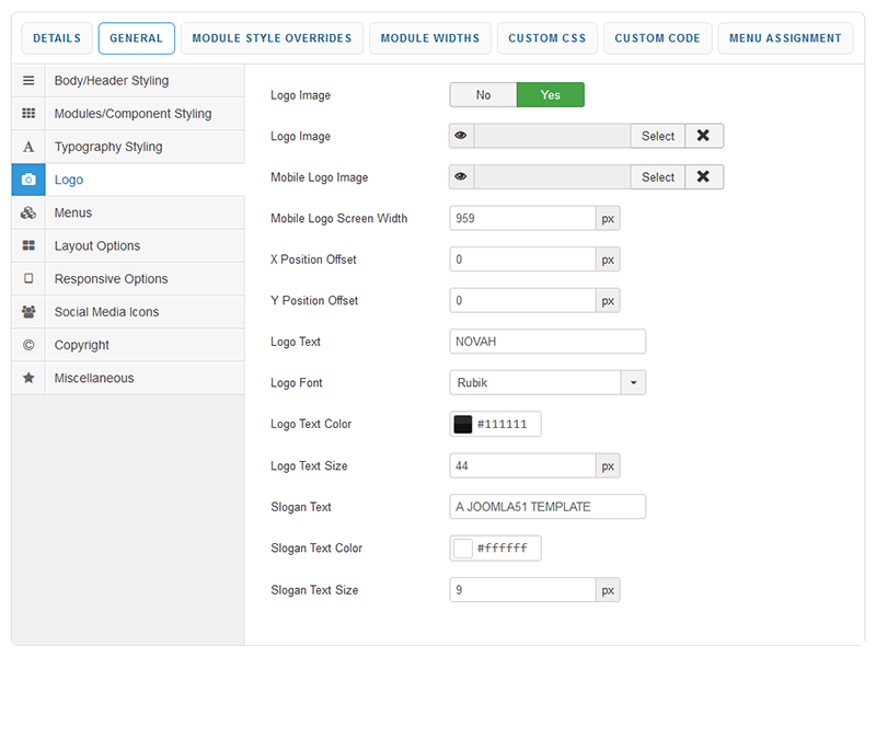 This section of the template parameters allows full control over your site logo with an array of easy to use options. Upload your logo image via the 'Select Logo Image' field and then use the X and Y axis field to tweak its position.