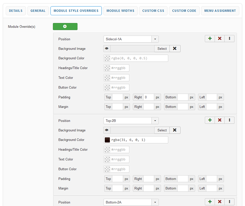 Module Style Overrides allow you to style individual module positions to your own taste. This greatly extends the control of how each of your module positions are displayed with a host of styling options including background image, background color, text color, heading color, button color and module padding. Multiple overrides can be created, each applied to the module position of your choice.